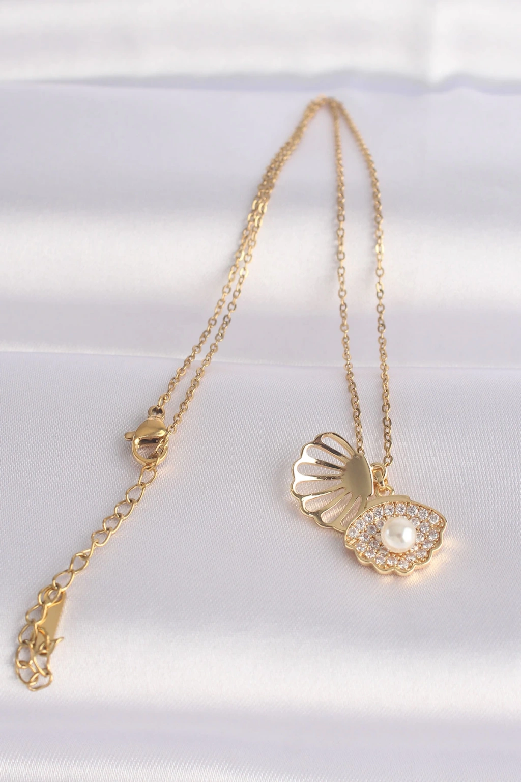 316L Çelik Zincir Altın Renk Zirkon Taşlı İnci Detay İstiridye Kolye