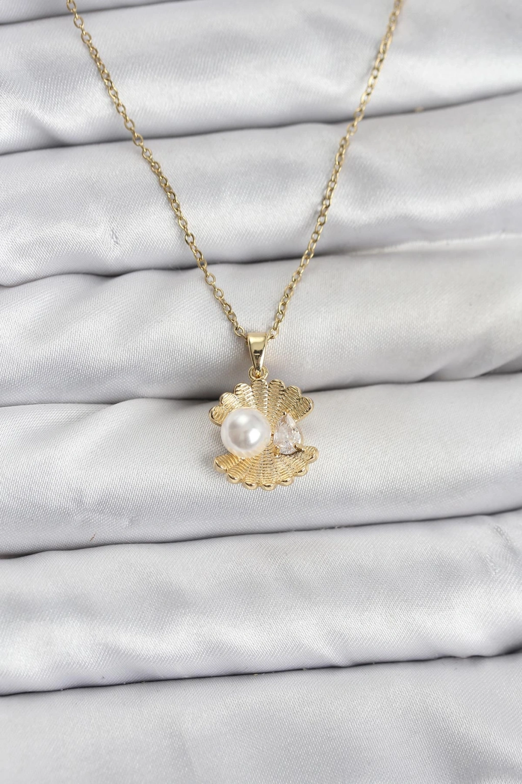316L Çelik Zincir Gold Renk İstiridye İnci Model Zirkon Taşlı Kadın Kolye