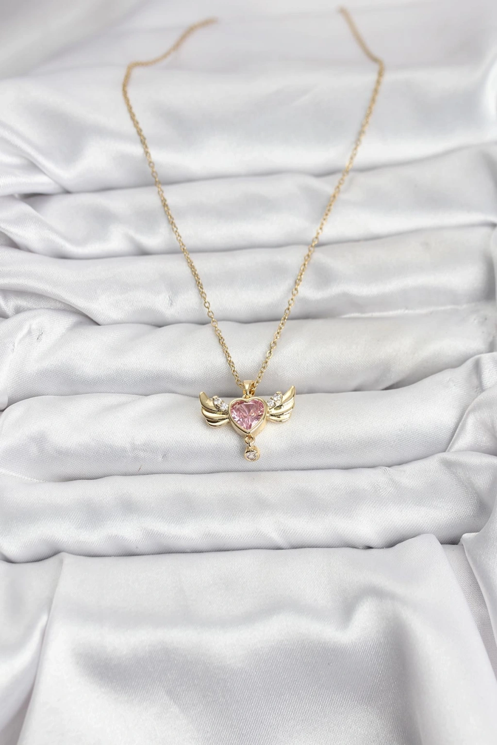 316L Çelik Zincir Gold Renk Kanatlı Kalp Model Zirkon Taşlı Kadın Kolye