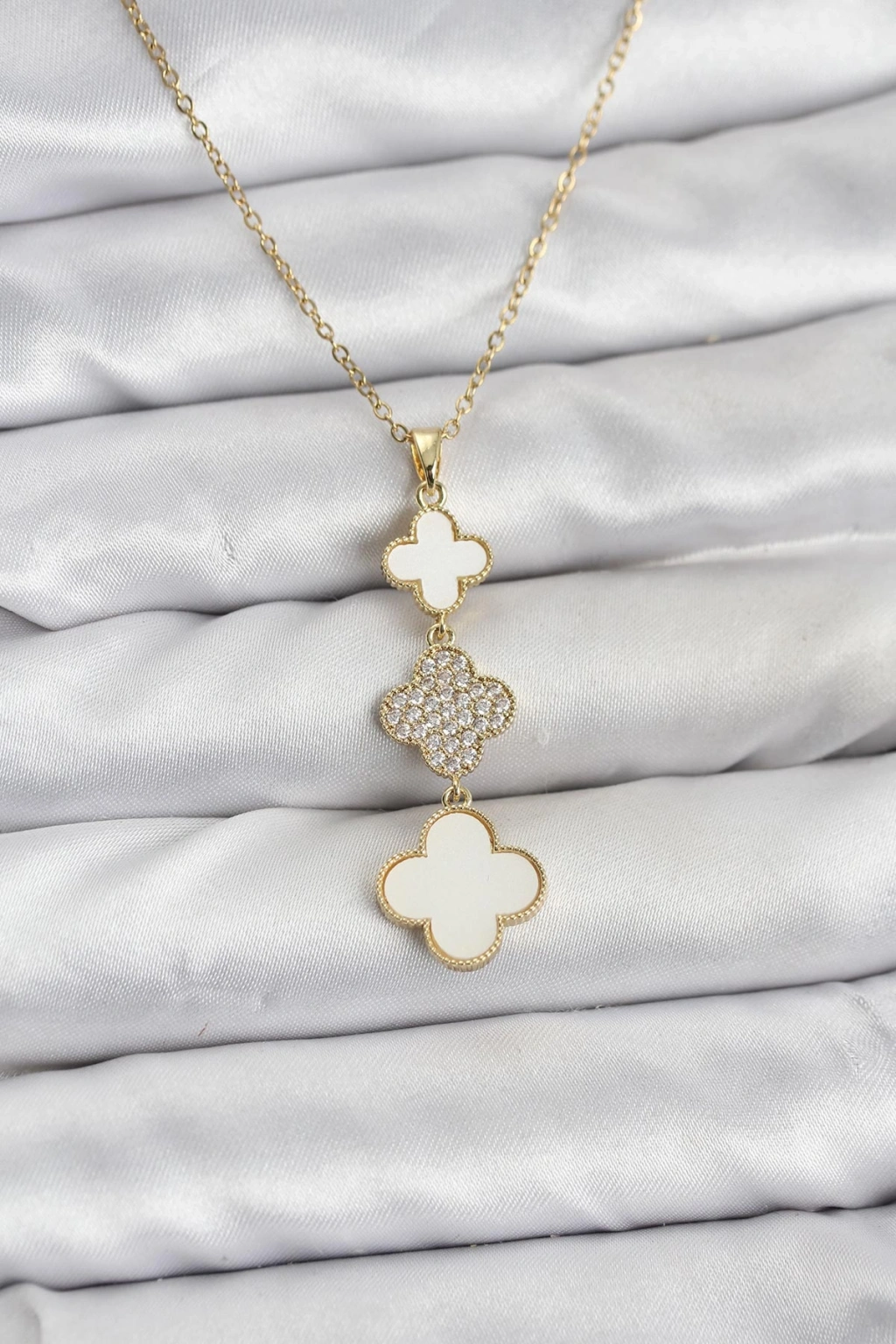 316L Çelik Zincir Gold Renk Yonca Detaylı Zirkon Taşlı Kadın Kolye