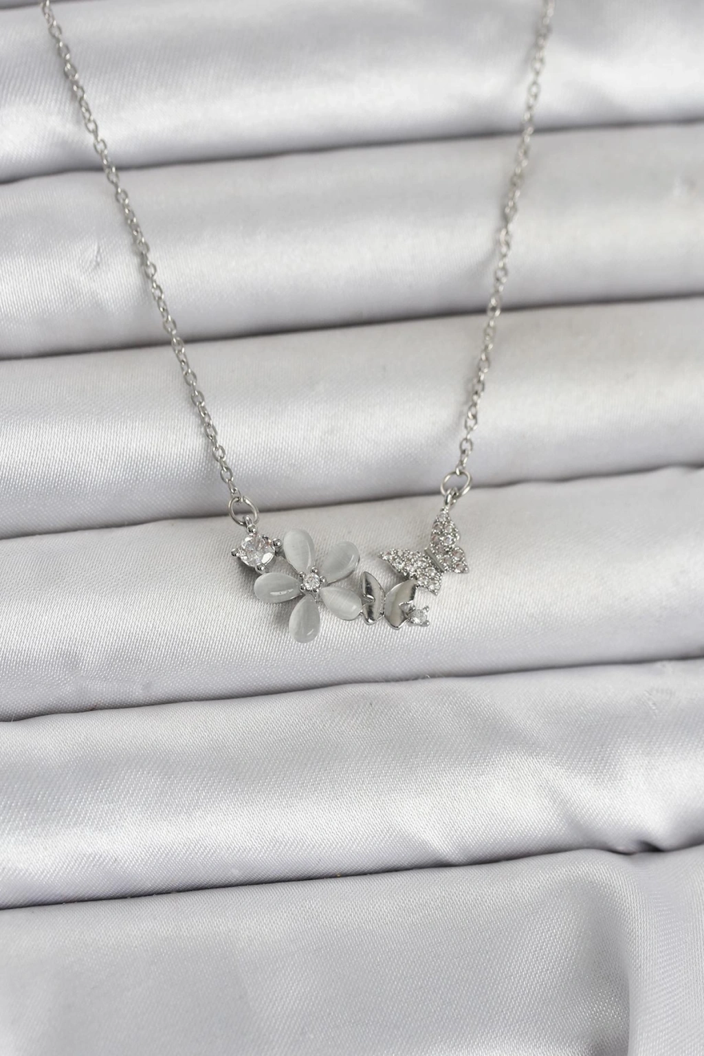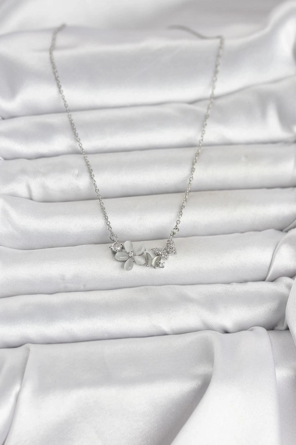 316L Çelik Zincir Gümüş Renk Çiçek ve Kelebek Model Kadın Kolye