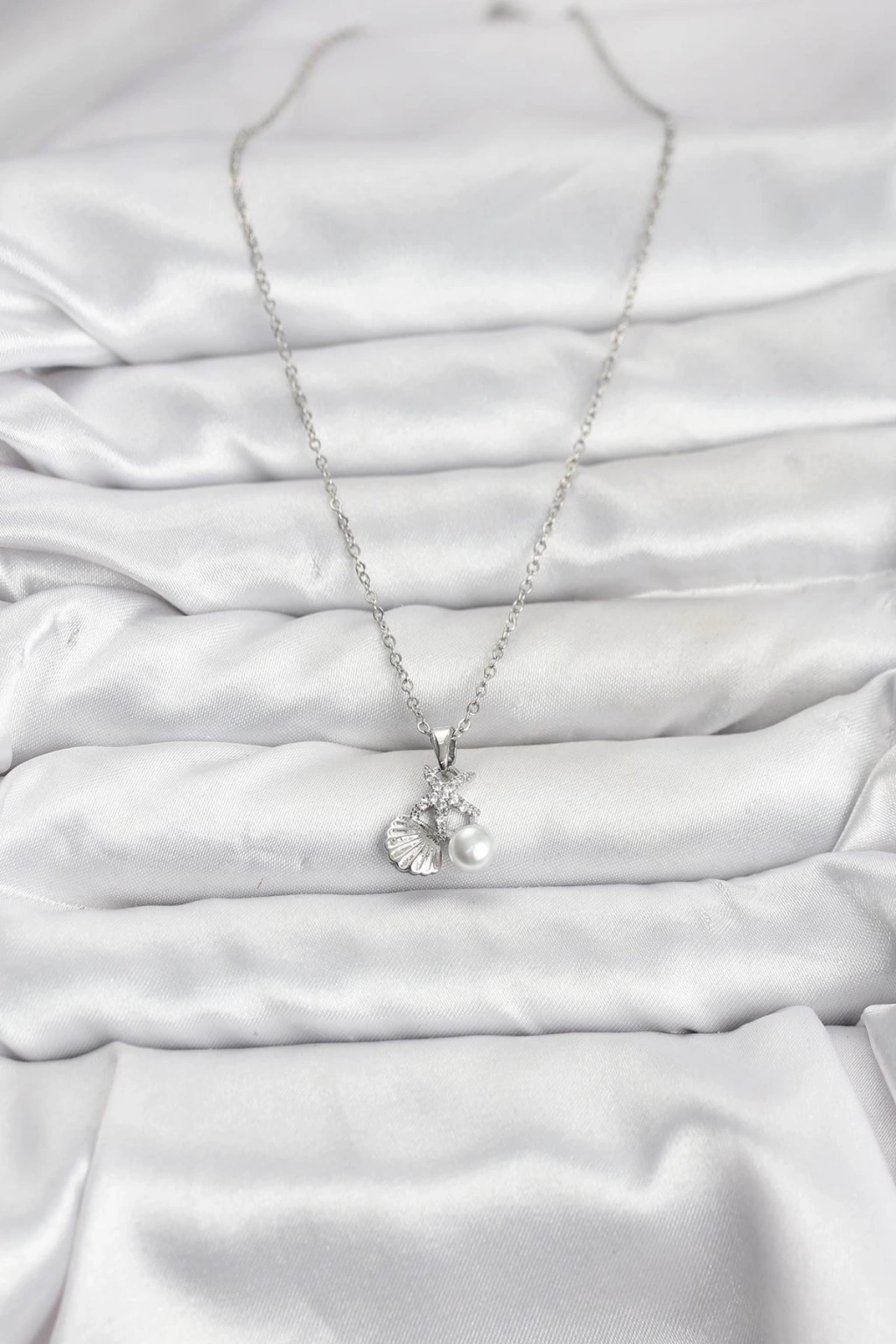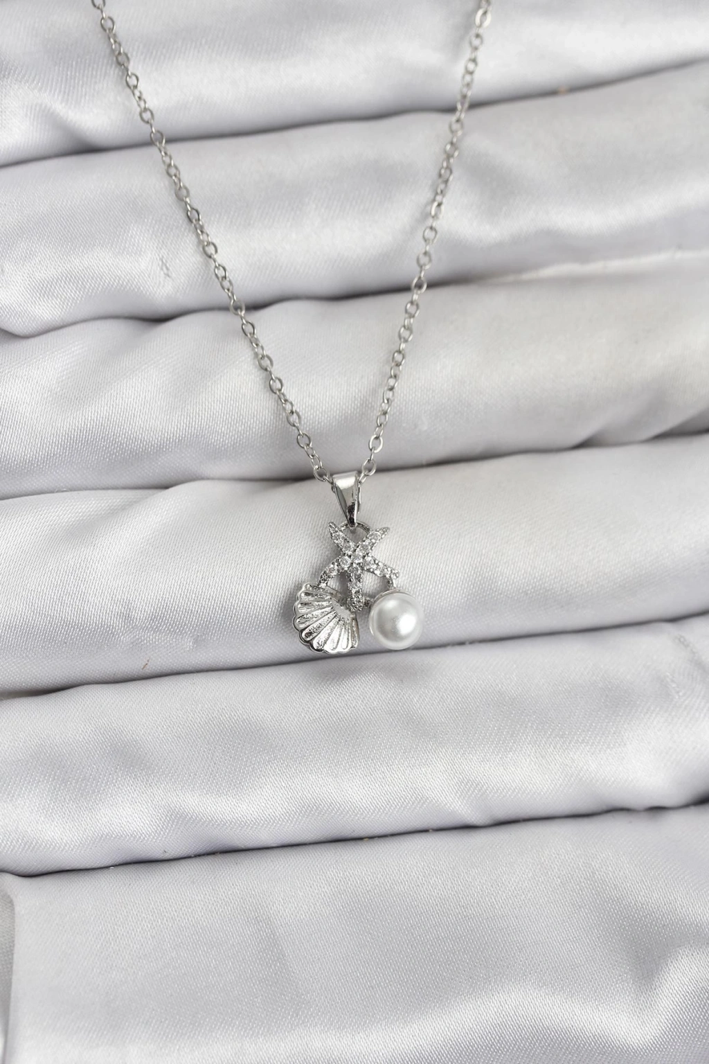 316L Çelik Zincir Gümüş Renk Deniz Kabuğu ve Deniz Yıldızı Model Zirkon Taşlı Kadın Kolye