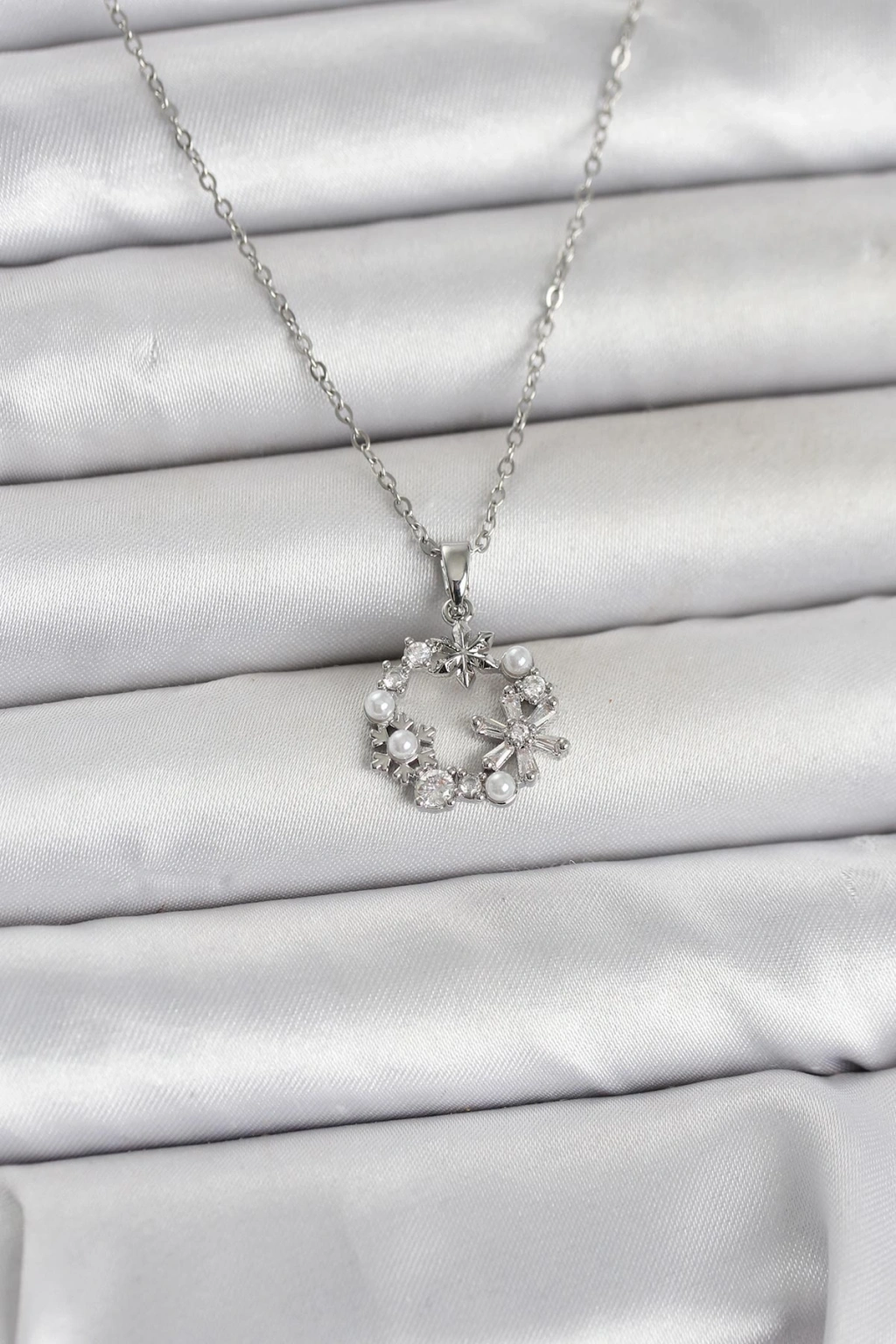 316L Çelik Zincir Gümüş Renk İncili Çiçek Model Kadın Koyle