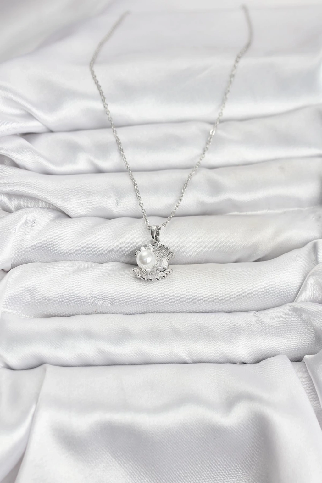 316L Çelik Zincir Gümüş Renk İstiridye İnci Model Zirkon Taşlı Kadın Kolye