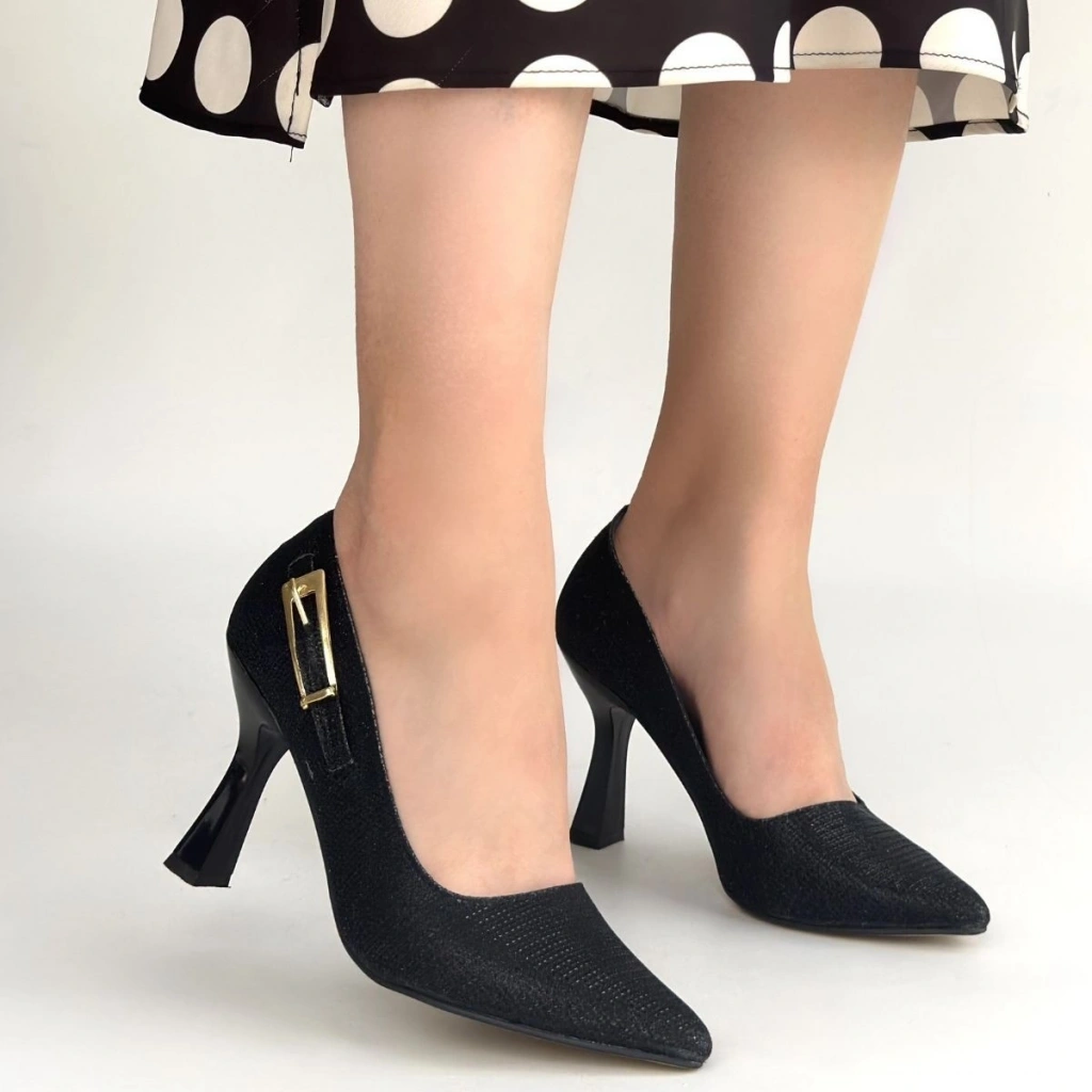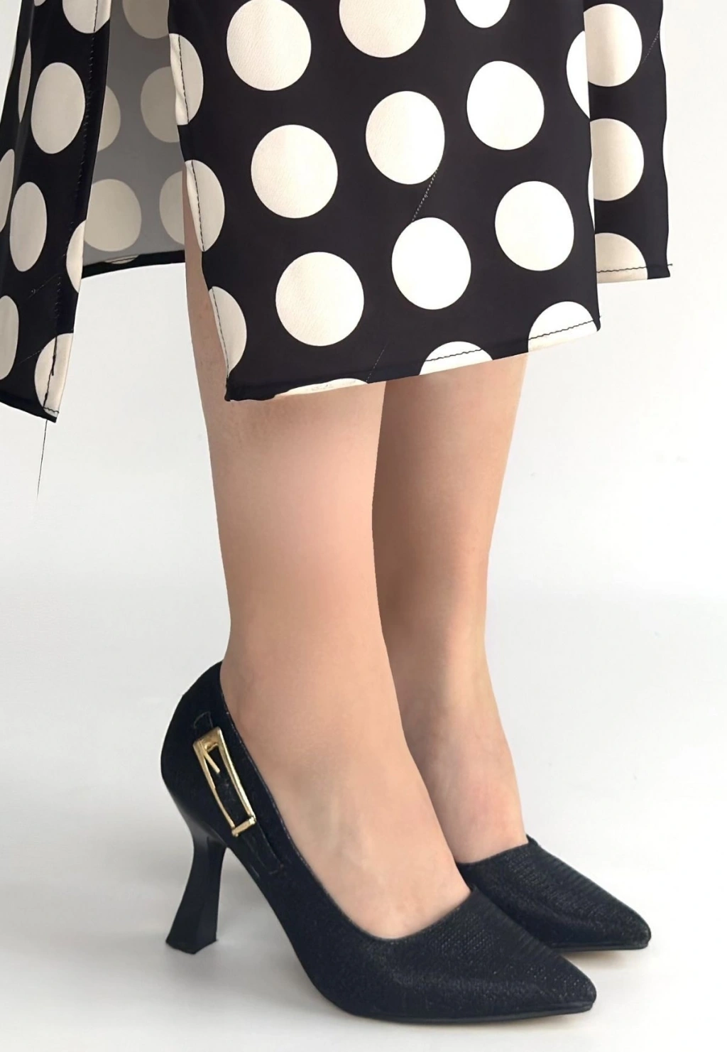 Cerin Siyah Saten Simli Topuklu Ayakkabı