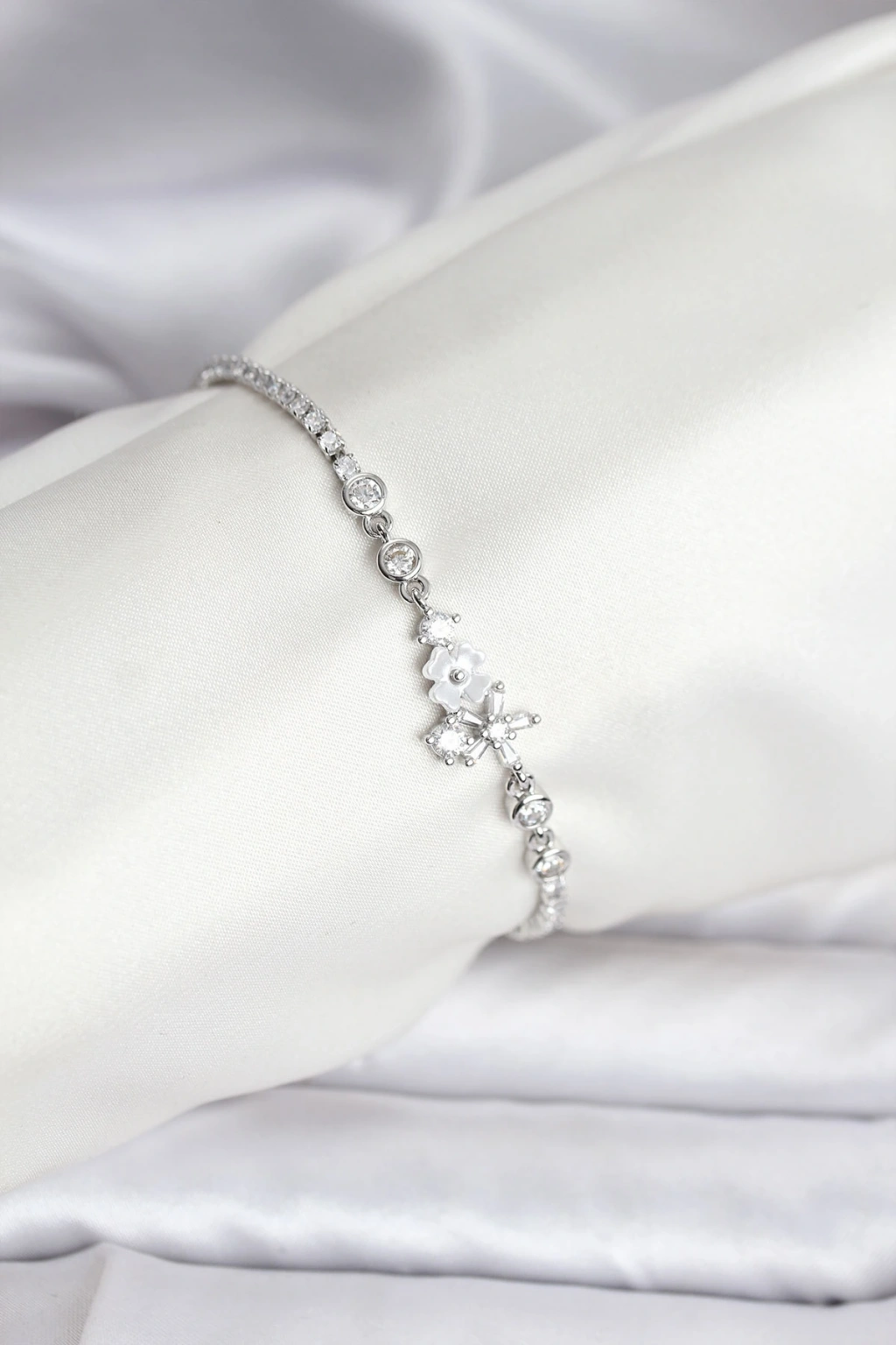 Çiçekli Model Zirkon Taşlı Gümüş Renk Su Yolu Kadın Bileklik