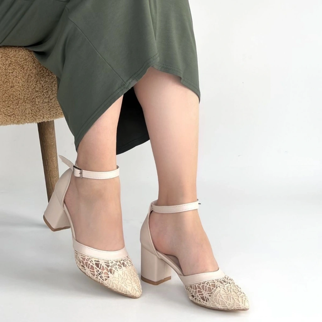 Dmop Bej Cilt Tül Detaylı Topuklu Ayakkabı