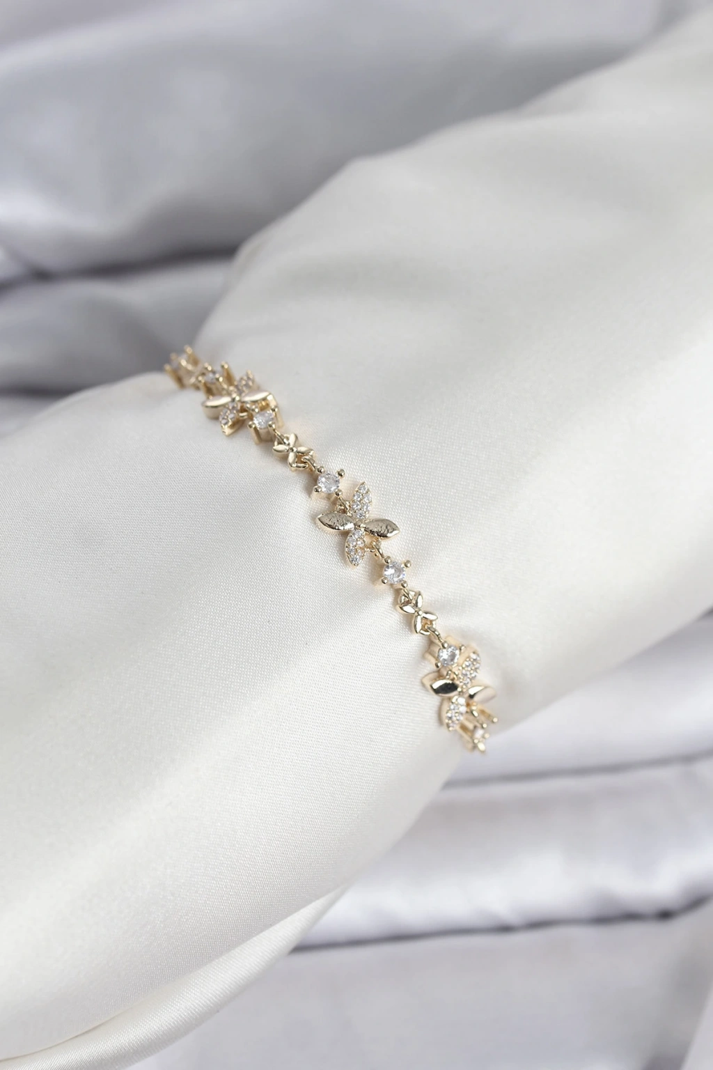 Gold Renk Yonca Model Zirkon Taşlı Asansörlü Kadın Bileklik