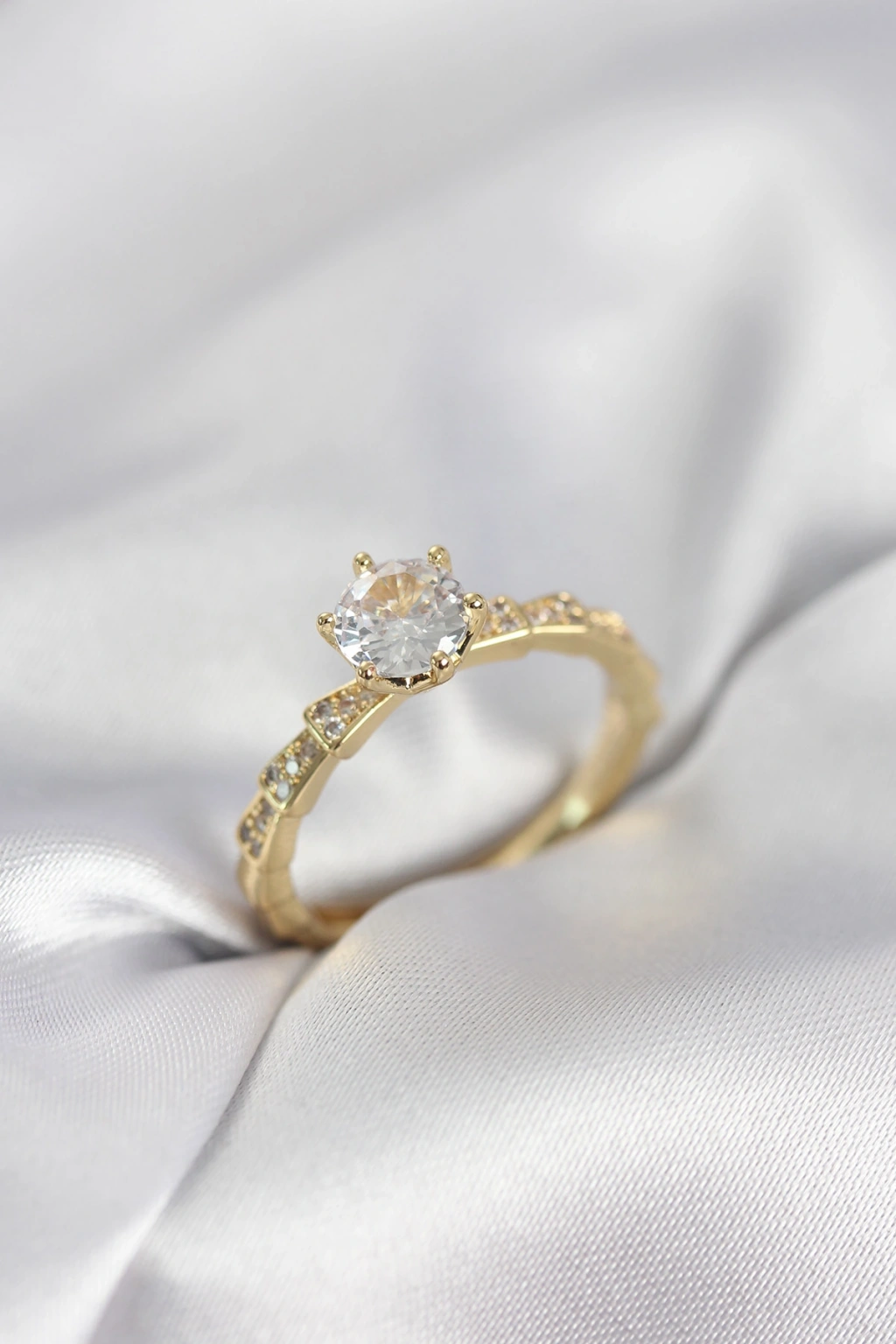 Gold Renk Zirkon Taşlı Tek Taş Model Kadın Yüzük