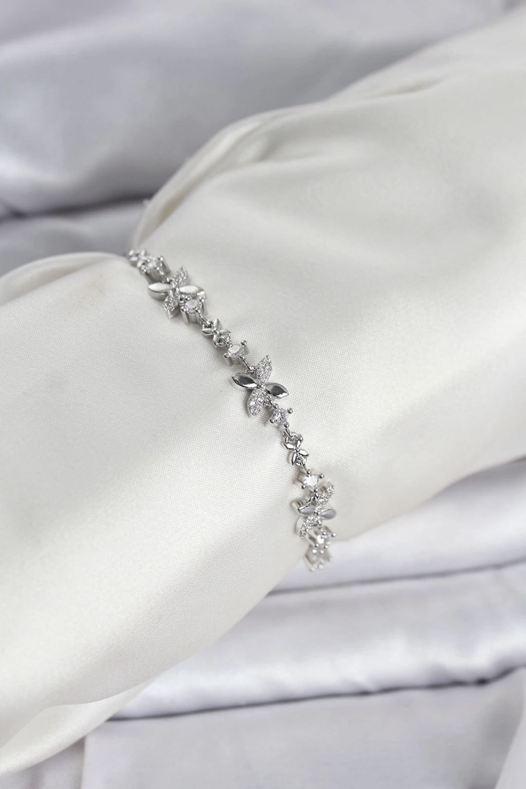 Gümüş Renk Yonca Model Zirkon Taşlı Asansörlü Kadın Bileklik