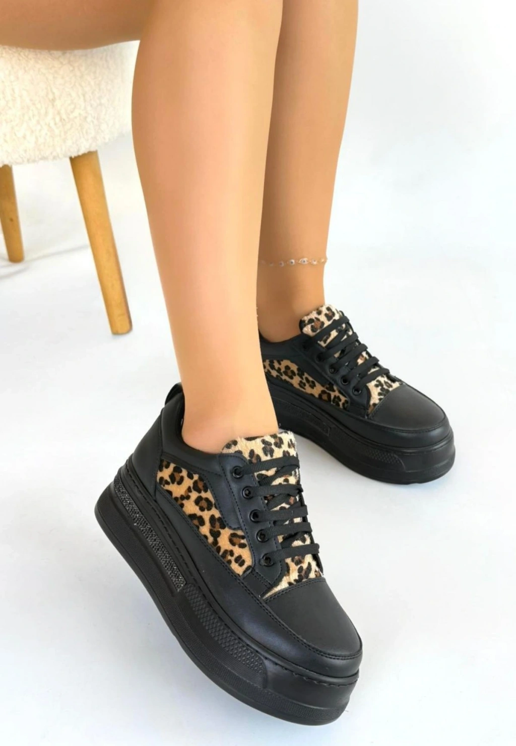 Lorrin Siyah Cilt Leopar Detaylı Bağcıklı Spor Ayakkabı