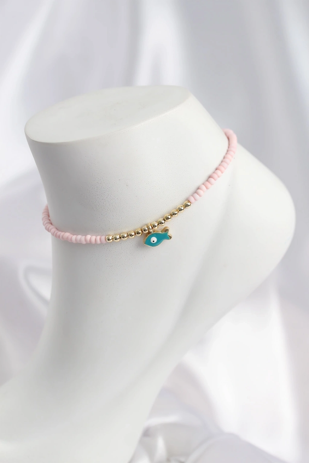 Pembe Renk Boncuklu Balık Figürlü Halhal