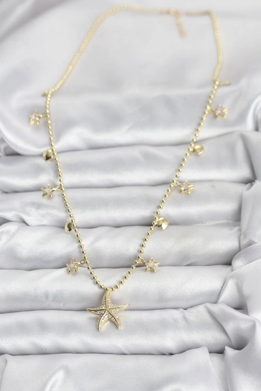 Pirinç Gold Renk Zirkon Taşlı Deniz Yıldızı Model Kadın Kolye