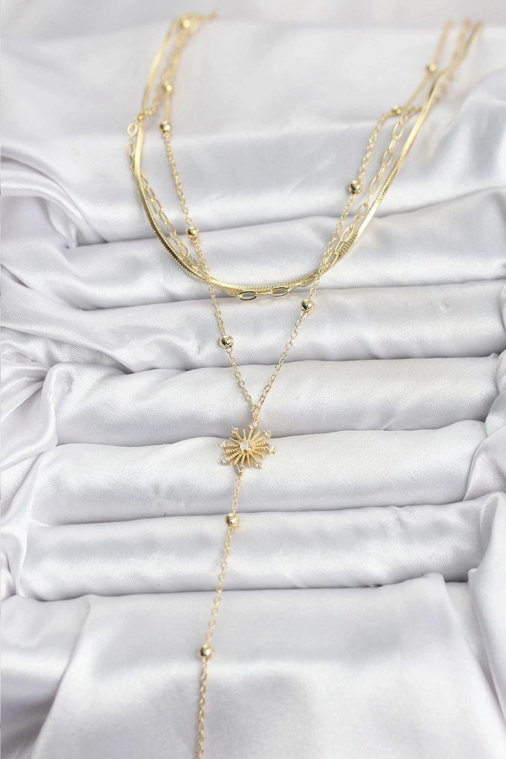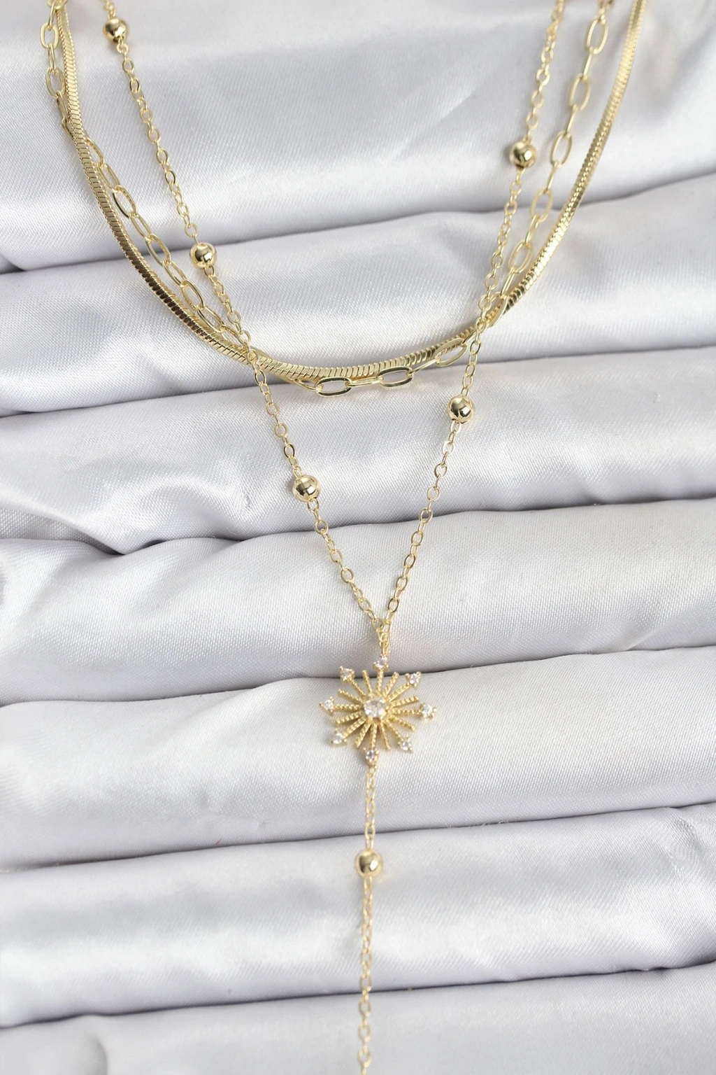 Pirinç Gold Renk Zirkon Taşlı Model Detaylı 3'lü Kombin Y Kadın Kolye