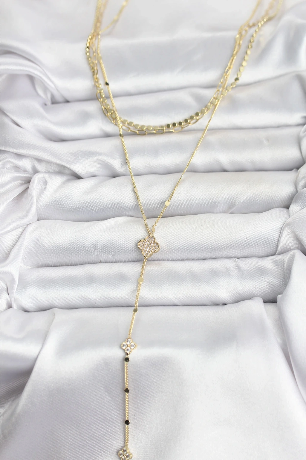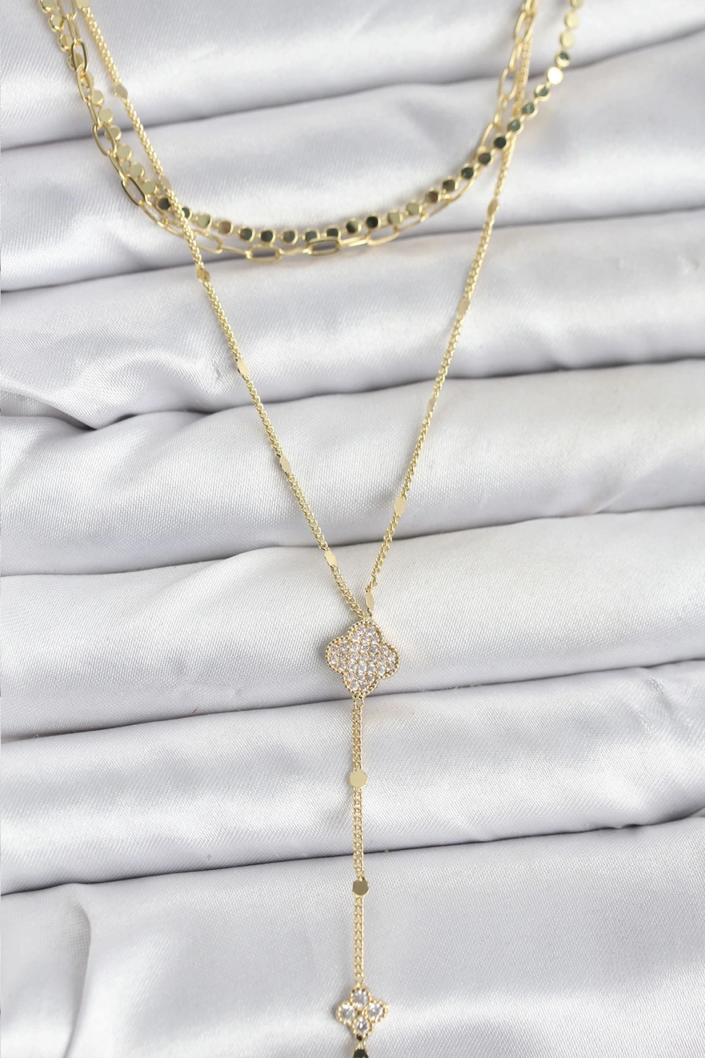 Pirinç Gold Renk Zirkon Taşlı Yoncalı Model Detaylı 3'lü Kombin Y Kadın Kolye