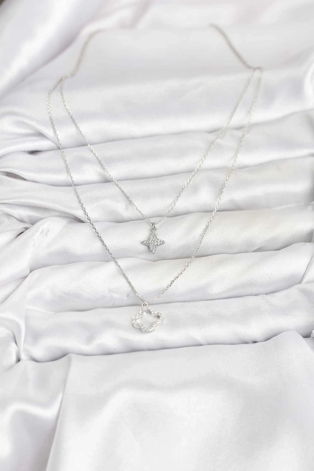 Pirinç Gümüş Renk Yonca Model 2'li Kadın Kolye
