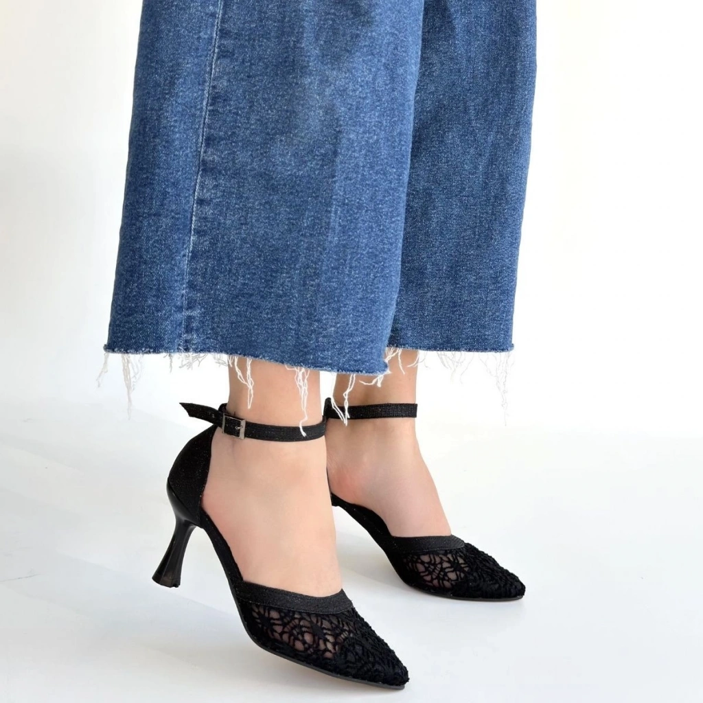 Weja Siyah Cilt Tül Detaylı Simli Topuklu Ayakkabı