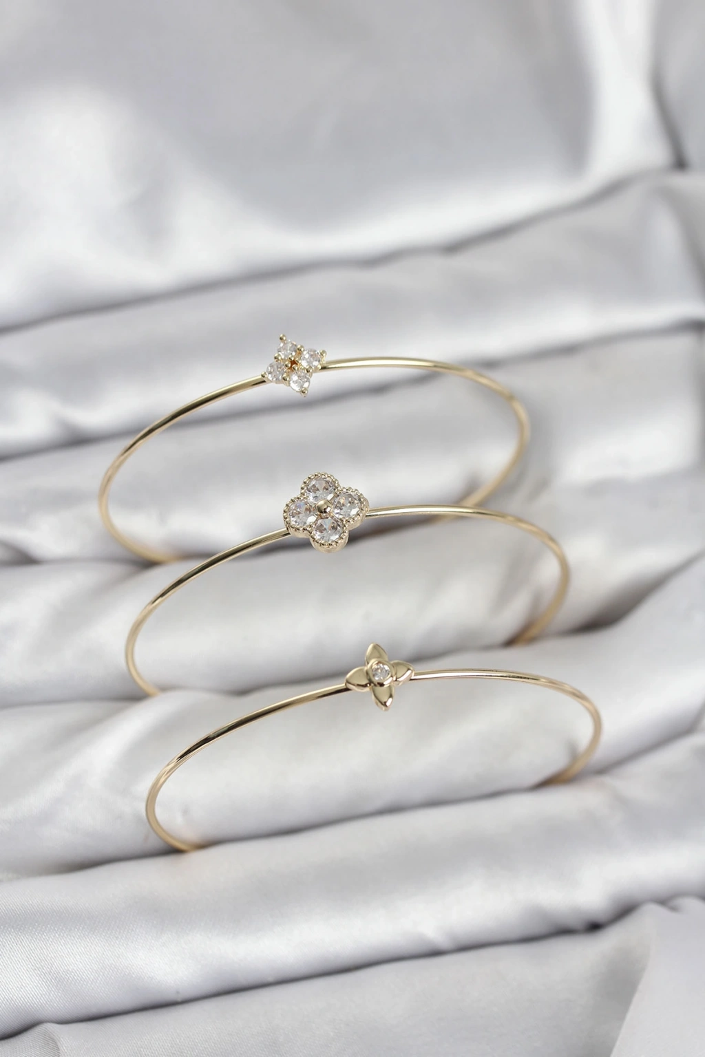 Zirkon Taşlı Gold Renk Yonca Tasarım 3'lü Kadın Bileklik Kombini